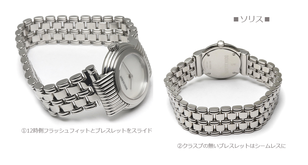 フランスの名門ジュエラー、ブシュロンが手がけた「ソリス」。一見すると、まず戸惑うのがバックルの存在が見当たらないことです。一般的な腕時計であれば、ブレスレットのどこかに必ずあるはずのバックル。ところがソリスは、腕にのせた瞬間からその“当たり前”が通用しません。